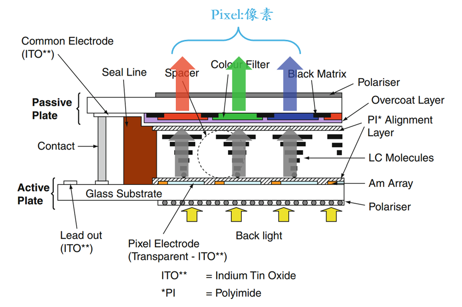 ایل سی ڈی (مائع کرسٹل ڈسپلے) ، جیسا کہ انتہائی پختہ اور وسیع پیمانے پر اپنایا ہوا ڈسپلے حل ہے ، مندرجہ ذیل بنیادی اصول پر کام کرتا ہے: ایک بیک لائٹ یونٹ سفید روشنی کا اخراج کرتا ہے ، جو تین بنیادی رنگوں کو تیار کرنے کے لئے آر جی بی کلر فلٹرز تک پہنچنے سے پہلے پولرائزر اور مائع کرسٹل پرت سے گزرتا ہے۔ آخر میں ، ہر پکسل کی چمک کو لاگو وولٹیج کے ذریعہ مائع کرسٹل انووں کی واقفیت کو کنٹرول کرکے ایڈجسٹ کیا جاتا ہے۔ یہ عمل کئی بنیادی اجزاء کے مربوط کام پر انحصار کرتا ہے: بیک لائٹ یونٹ ، ٹی ایف ٹی سرنی ، مائع کرسٹل پرت ، اور رنگین فلٹرز۔